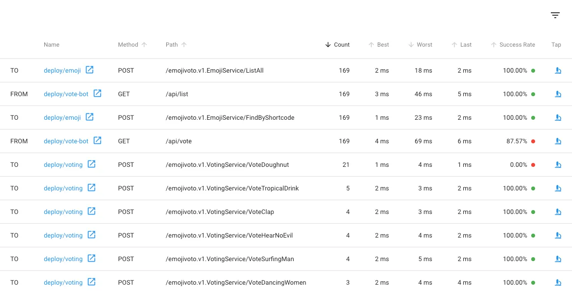 The first thing you'll see here is that the web deployment is taking traffic from vote-bot (a deployment included with emojivoto to continually generate a low level of live traffic). The web deployment also has two outgoing dependencies, emoji and voting.